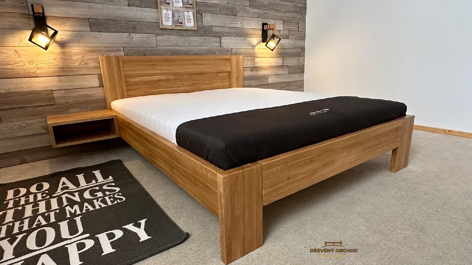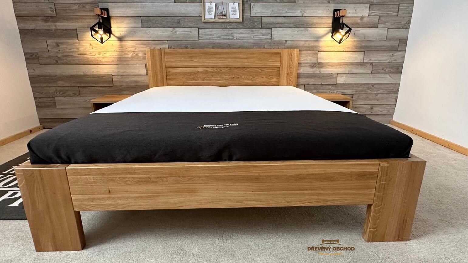 Součástí postele jsou masivní závěsné noční stolky