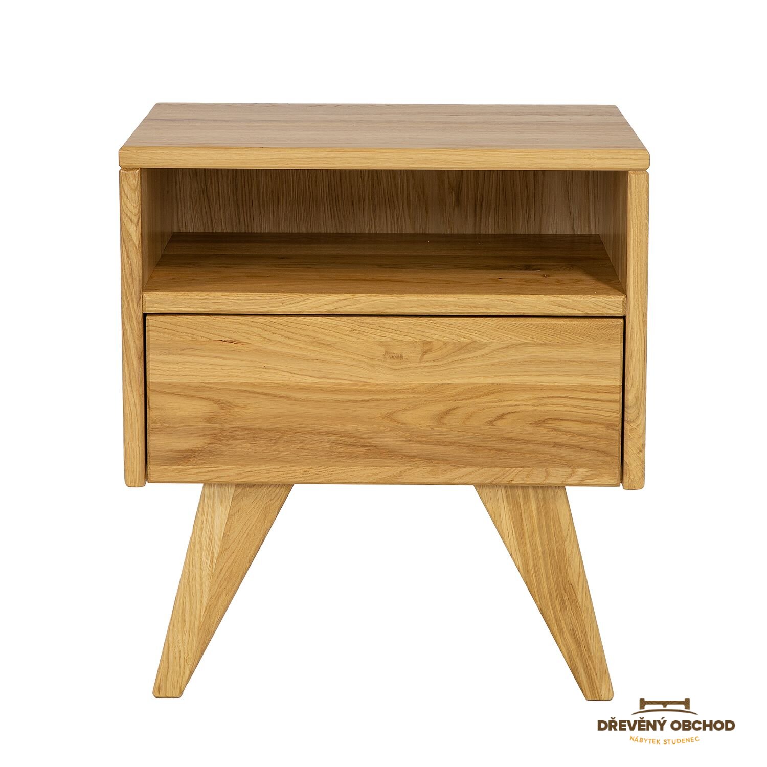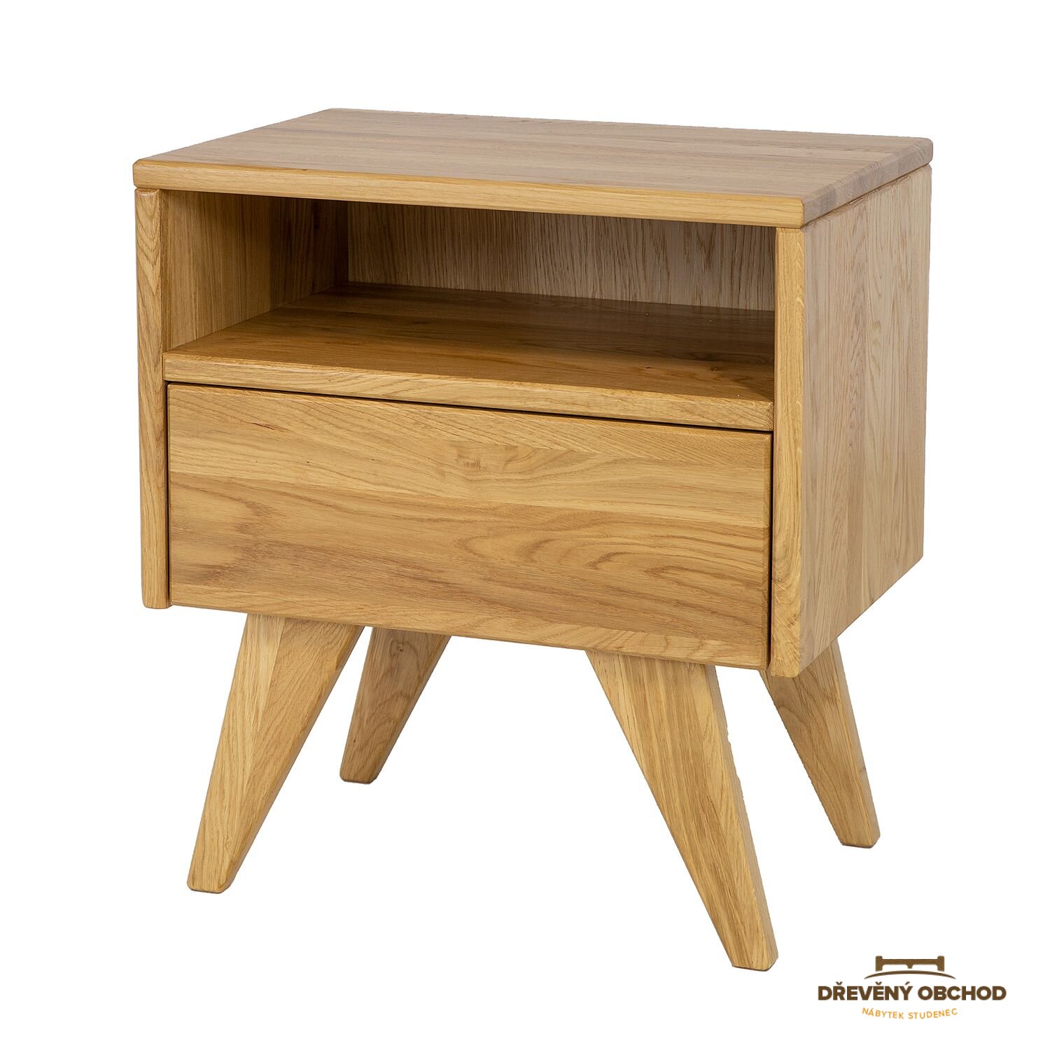 Stylový noční stolek SN401, vyrobený z masivního bukového dřeva. Funkční korpus skříňky se skládá z jedné otevřené police a jedné bez úchytové zásuvky, která se skvěle hodí pro uložení šikovné kosmetiky nebo knih. Minimalistický design a jedinečné, šikmé nohy dělají, že noční stolek SN401 dokonale zapadá do moderního stylu. Malá, ale krásná stolní deska je ideálním místem pro rodinnou fotografii nebo dekorativní noční lampu. Teplo přírodního bukového dřeva, ze kterého byl vyroben, vytvoří v ložnici krásnou útulnou atmosféru.