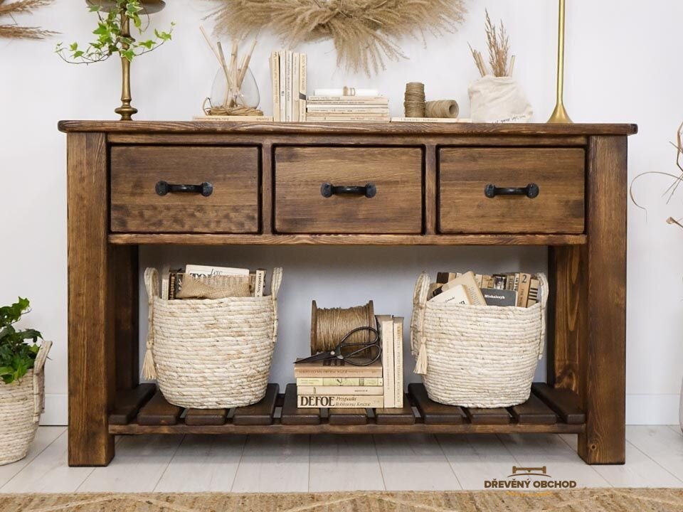 Stůl z borovice Rustyk je dekorativní kus nábytku vyznačující se vysokou funkčností. Široká pevná horní část umožňuje vystavit své oblíbené dekorace. Prostorné zásuvky nabízejí prostor pro uložení drobností. Použití dřevěných vodítek zaručuje bezporuchový provoz. K praktičnosti nábytku patří i spodní police, jejíž výška umožňuje umístit velké dekorativní koše nebo rostliny. Pevné nohy o šíři 9 cm zajišťují stabilitu konstrukce. Použití nejkvalitnějšího borovicového dřeva k výrobě činí nábytek extrémně odolným a při správné péči potěší svým vzhledem léta.