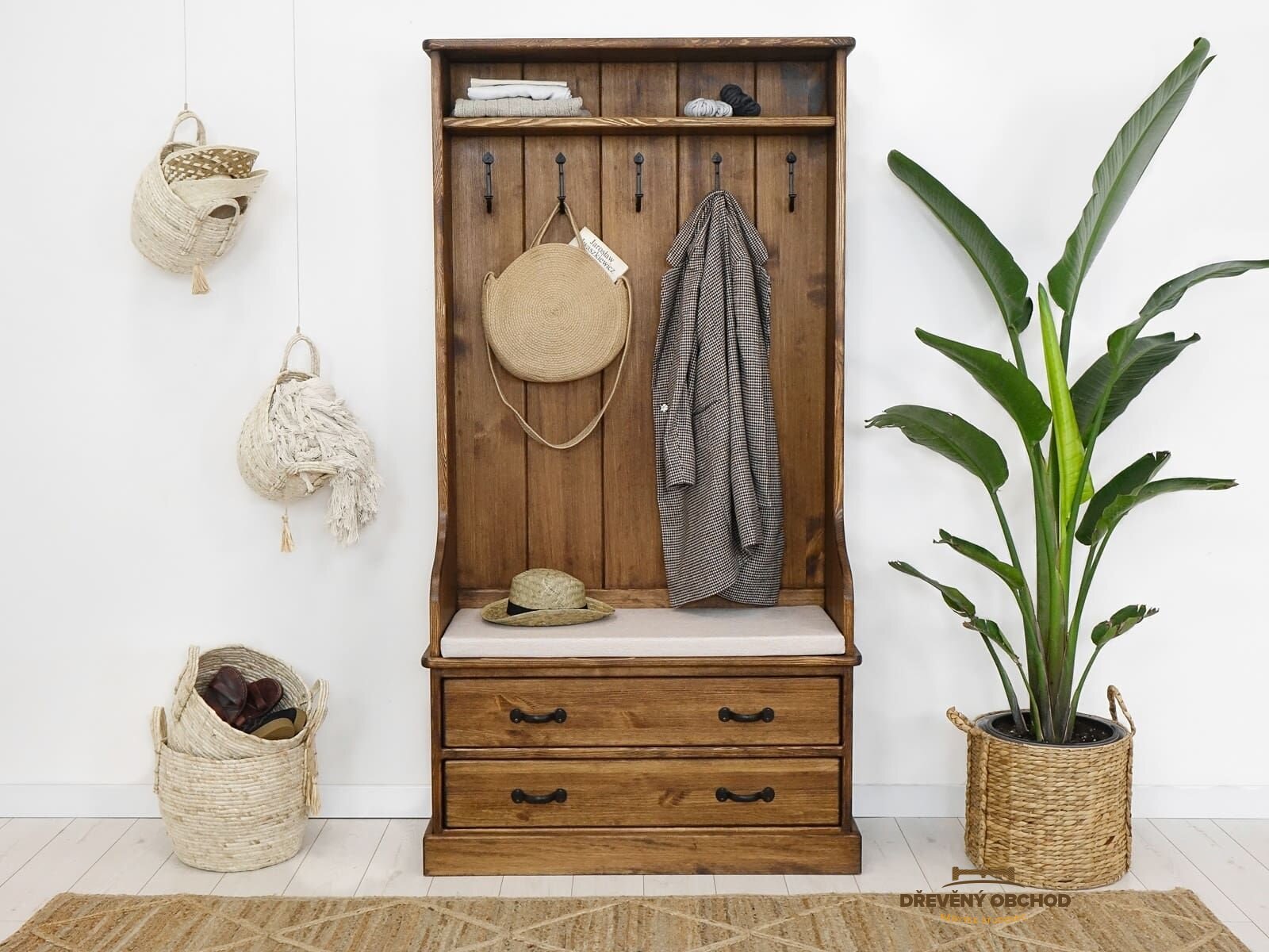 Šatna je vybavena pěti věšáky, policí a dvěma prostornými zásuvkami na dřevěných vodítkách. Díky tomu máme prostor pro svrchní oděvy, šátky, šály či čepice i další doplňky a oblečení. Funkčnost nábytku navíc zvyšuje sedák, který umožňuje pohodlné přezouvání. Sedací část je doplněna polštářem v neutrálním snímatelném potahu.