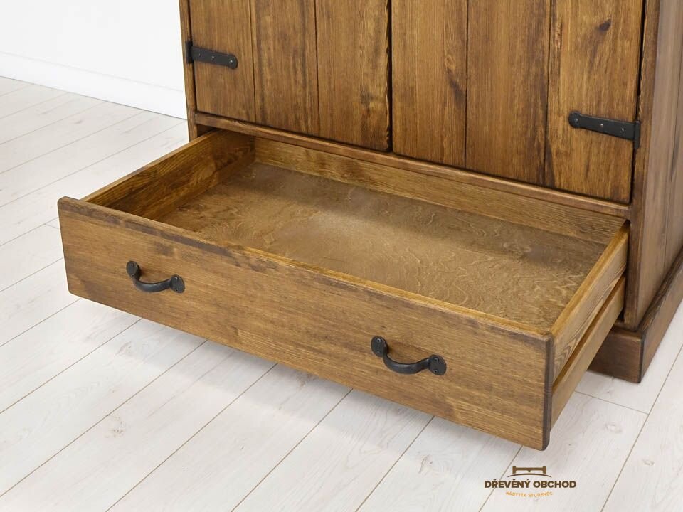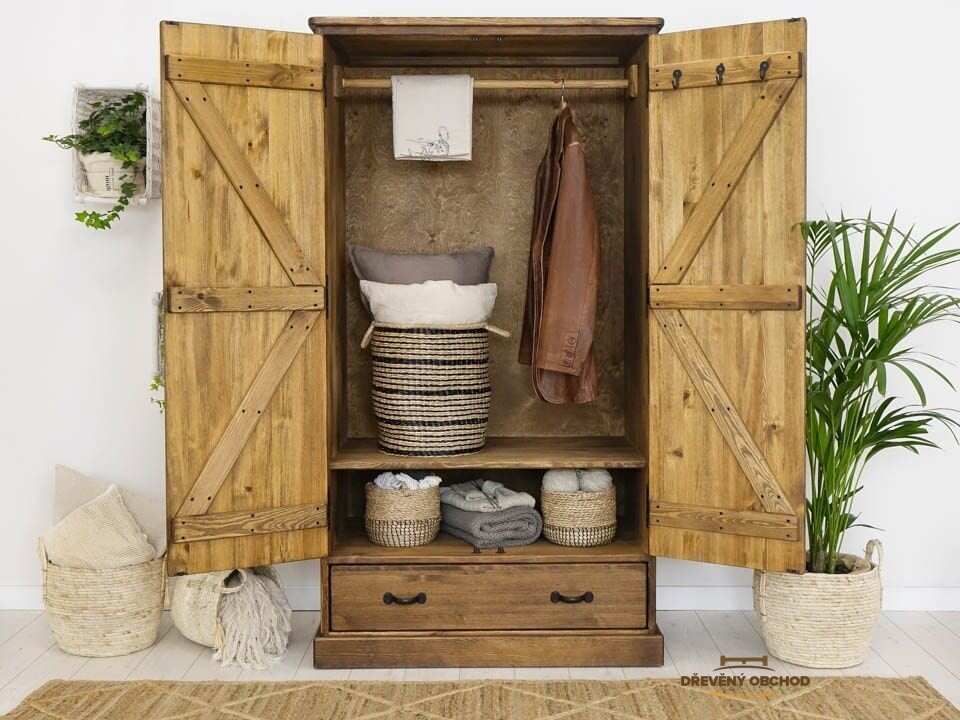 Charakteristickým znakem šatní skříně Rustyk 105 je použití rustikálních prvků, díky kterým nábytek připomíná nostalgický návrat do minulosti. Úspěšné spojení masivnosti a idylického charakteru borovicového dřeva s moderním designem vyústilo ve vytvoření jedinečné a praktické šatní skříně, která dokonale zapadá do současných trendů interiérového designu a zároveň má jedinečný charakter.