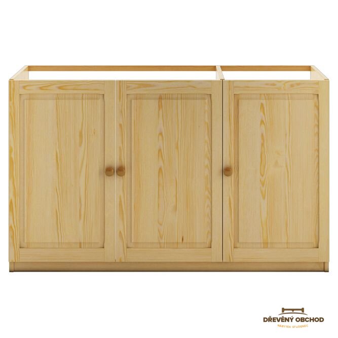 Dřevěná skříňka pod dřez, celá vyrobená z borovicového dřeva.