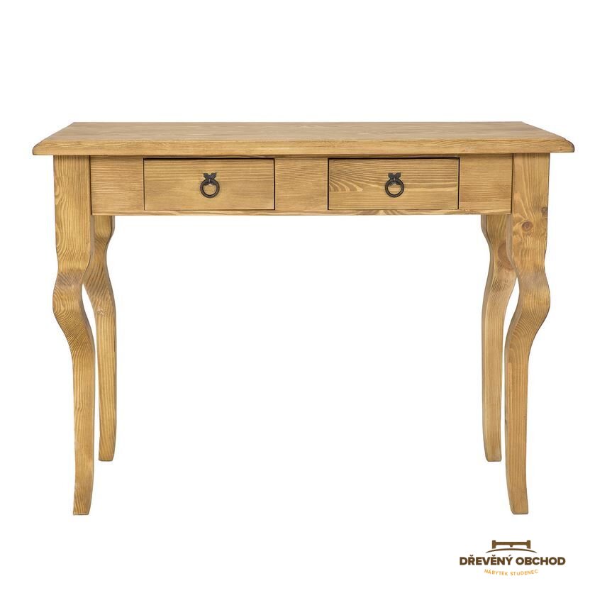 Voskovaný toaletní stolek – konzole LT701. Navrženo v rustikálním stylu, vyrobeno výhradně z masivního borovicového dřeva. Je nezbytným prvkem každého stylového interiéru. Skvěle poslouží jako stolek například v kanceláři i jako toaletní stolek do ložnice. LT701 má subtilní, mírně zakřivené nohy a dvě praktické zásuvky, které jsou perfektní pro uložení kosmetiky a drobností. K výrobě byly použity ručně vyrobené kovové panty a madla s letitým efektem. Viditelná struktura zdůrazňuje krásu přírodního dřeva. LT701 dodá každému interiéru jedinečnou atmosféru, plnou vřelosti a rodinné atmosféry.