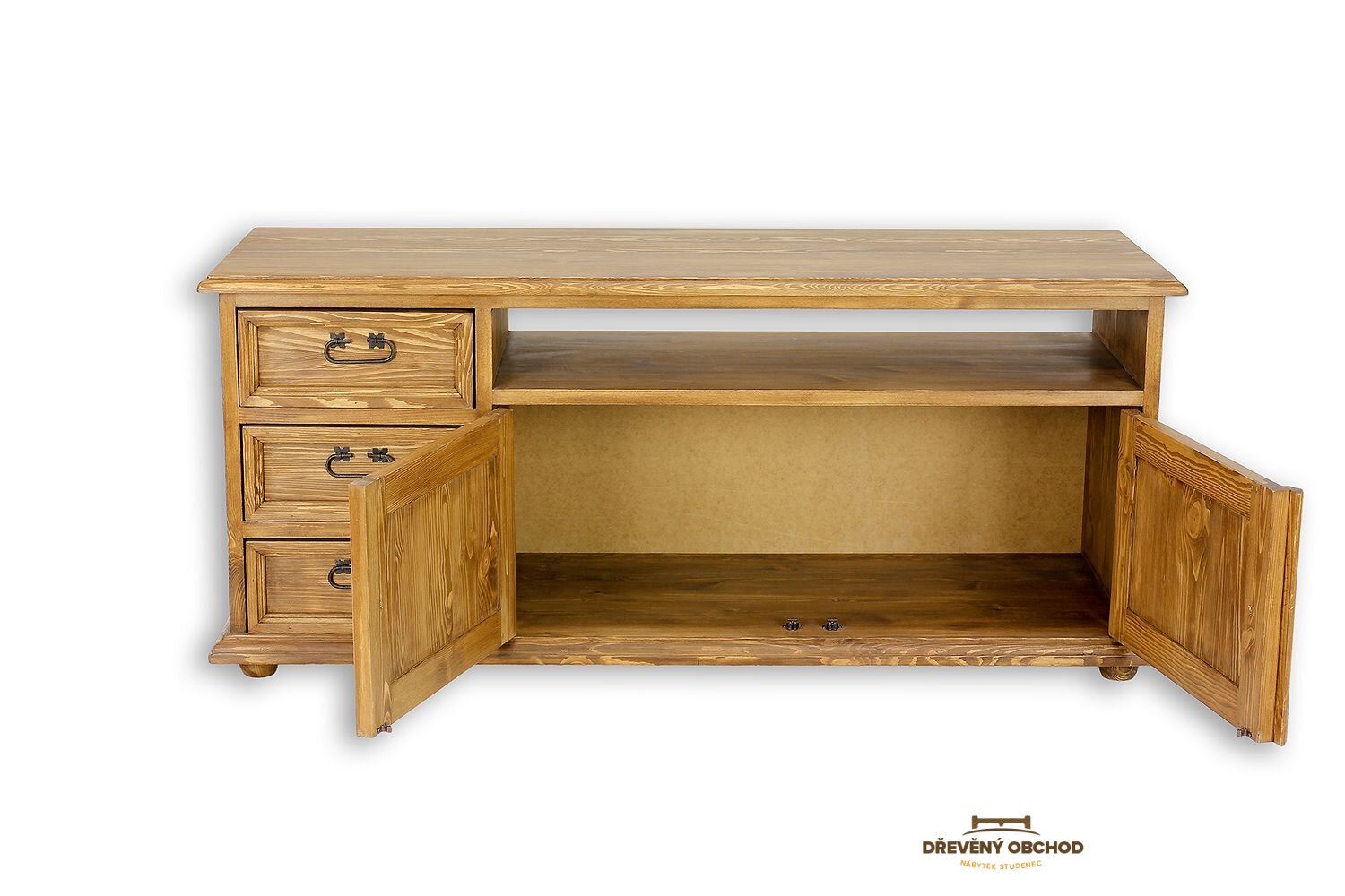 Voskovaná TV skříňka RV703 je navržena v rustikálním stylu a celá vyrobena z masivního borovicového dřeva. Sada na dřevěných nohách v podobě kuliček. Na levé straně má tři zásuvky, na pravé straně se nachází uzavřená skříňka s policí a dvoukřídlými dvířky, která se skvěle hodí jako prostor pro herní konzoli, přehrávač, desky a další drobnosti. Nábytek má odolnou a pevnou konstrukci. K výrobě byly použity ručně vyrobené kovové panty a madla s letitým efektem. Stolek RV703 dodá každému interiéru jedinečnou atmosféru, plnou tepla a rodinné atmosféry.